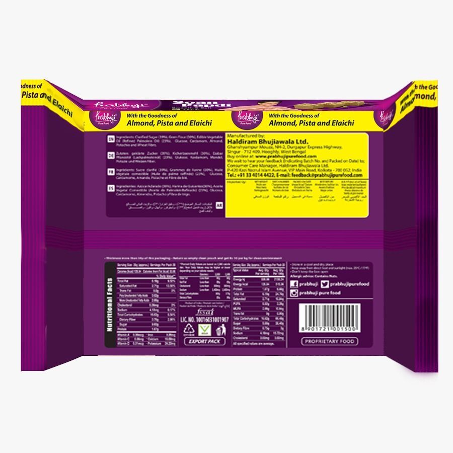Clarified Sugar (39%), Gram Flour (30%), Edible Vegetable Oil (Refined Palmolein Oil) (23%), Glucose, Cardamom, Almond, Pistachio and Wheat Fibre.