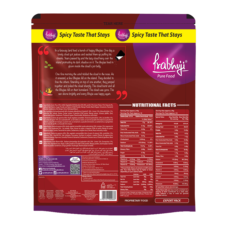 Gram Flour (40%), Gram Pulses (15%), Edible Vegetable Oil (Palmolein Oil) (20%), Lentils, Peanuts, lodised Salt, Black Salt, Raisins, Sugar Powder, Chillies, Spices, Nutmeg and Mace.