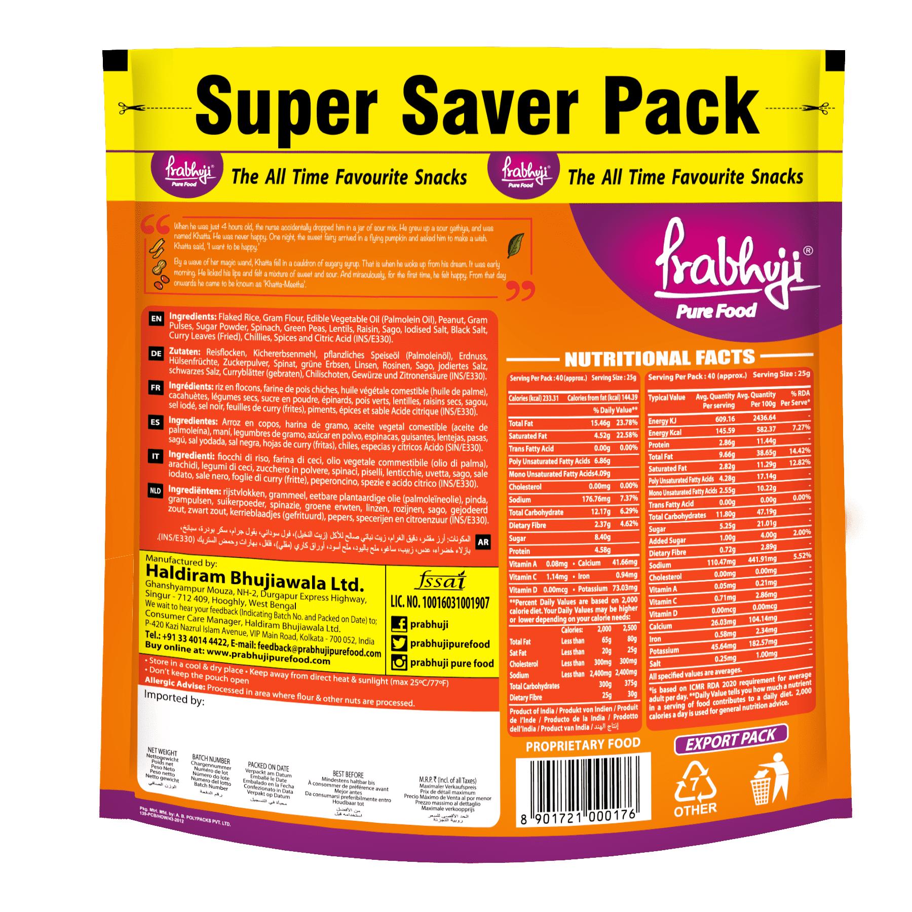 Flaked Rice 40%, Gram Flour 20%, Edible Vegetable Oil (Palmolein Oil) 20%, Peanuts 6%, Gram Pulses 6%, Sugar Powder, Spinach, Green Peas, Lentils, Sago, Raisins, lodised Salt, Curry Leaves (Fried), Spices (Turmeric Powder, Black Salt & Clove) and Citric Acid (INS/E 330).